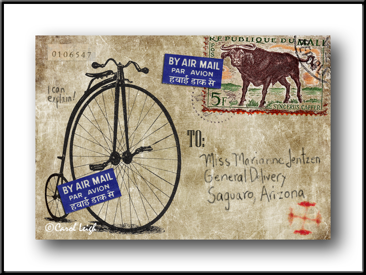 The elements here are my photos of a cabinet card (old photo) found at an antique store, photos of postage, cigar labels, numbers, handmade rubber stamps, handwriting, and more. It's the absurdity of the title combined with the postcard that amuses and delights me! ©Carol Leigh